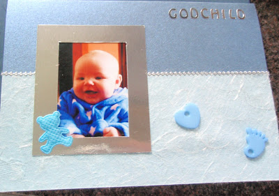 I took a picture of my Godchild and created a frame from silver card stock and completed it with a small padded teddy bear, and ABC peel offs for the wording Godchild.